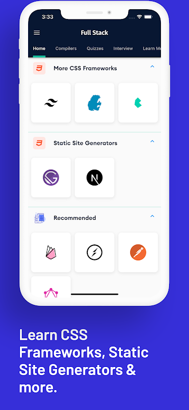 私たちのアプリは、HTML、CSS、JavaScript を使用したフロントエンド開発、Django、Flask、Laravel、CodeIgniter、Ruby on Rails、Spring などの一般的なバックエンド フレームワークを使用した Web 開発など、フルスタック開発者になるために必要なすべての基本概念とツールをカバーしています。 、および Firebase、GraphQL、Webpack、Postman などのライブラリ。また、多くのプログラミング言語のコンパイラ、インタラクティブなクイズ、インタビューの質問、およびその他の機能を提供して、進捗状況を評価し、学習プロセスに従事し続けるのに役立ちます.