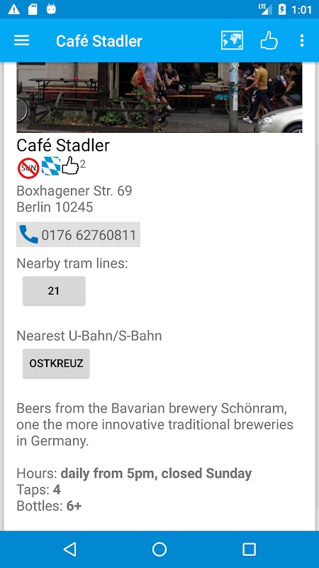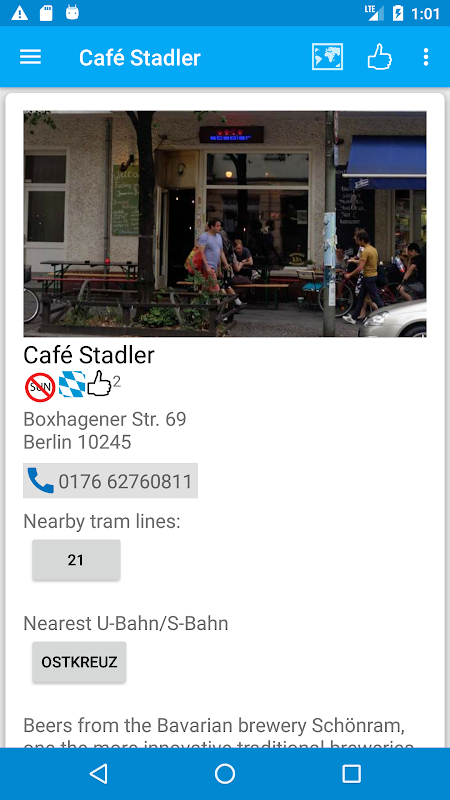 Each entry contains a review, photograph, nearest U Bahn or Tram line, contact info, website and twitter handle for each pub. Check the pub's twitter feed for news without leaving the app. A map will show the location of the pub as well as nearby listed pubs.