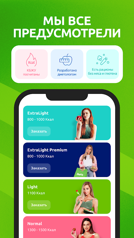 5. KBZhUと成分に関する情報:BeFitのすべてのメニューには、カロリー、タンパク質、脂質、炭水化物(KBZhU)の含有量に関する詳細な情報が記載されています。