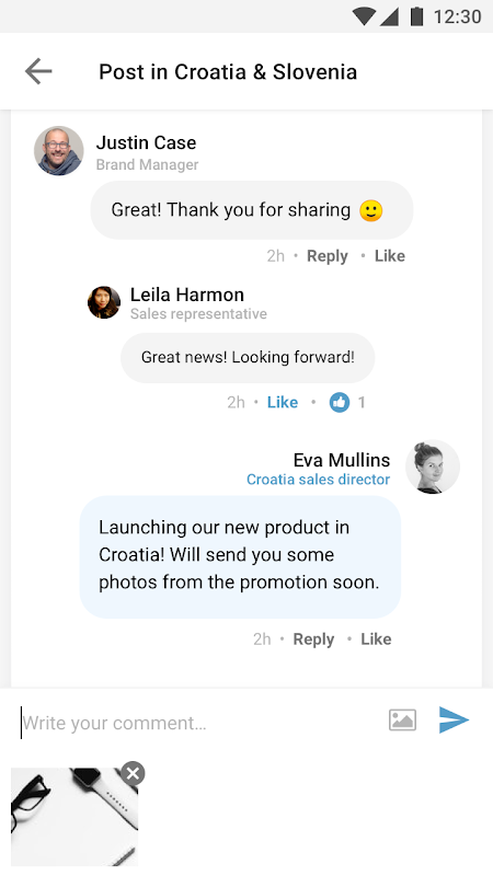 News are published by Designated Content Creators who can create a more engaging content by uploading photos or videos alongside text. There is an option to categorize each post by division and post something on behalf of other colleagues. Users have access to the news in the main feed. They can scroll through it to read older posts and switching between tabs makes it easy to filter them by divisions. Each post offers users the ability to actively participate by commenting, leaving reactions and replying to comments.