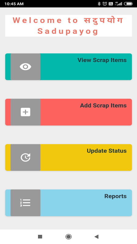 ユーザーはSadupayogスクラップアプリを使用してスクラップアイテムを追加できます。入力するフィールドは、BHELユニット、スクラップカテゴリ、簡単な説明です。ユーザーは、ステータスの更新機能を使用して、スクラップ処理の進行状況を更新することができます。位置センサーを使用してアイテムの位置を自動的に取得し、モバイルカメラを使用してスクラップアイテムの最新の写真をクリックできます。