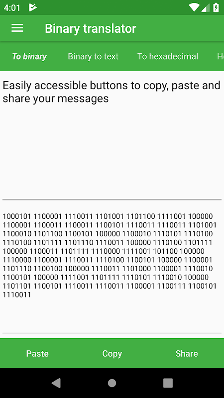 このアプリでは、テキストとバイナリの間で変換することができます。あなたは結果をコピーしたり、お友達と直接それを共有することができます。バイナリ・トランスレータは、友人に秘密のメッセージを送信し、バイナリを学ぶための簡単な方法を提供しています。