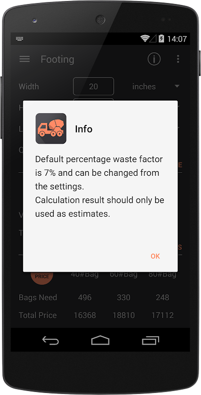 スラブ、壁、フーチングと列を含む - 立方ヤードまたは様々な構造のために必要なフィートまたはメートルを計算することが容易になります。 40#の量を計算し、あなたが必要とする予混合コンクリートの60#80#の袋。さらに、ボリューム単位当たりの価格を設定することができ、パッケージごとの費用を推定する。