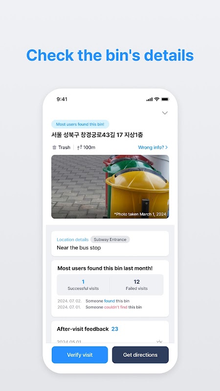 - Verify your visit when you're within 50 meters of the bin