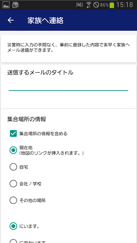 (メール件名、メールの宛先、自身の安否状況、現在の位置情報、などを簡単に作成)