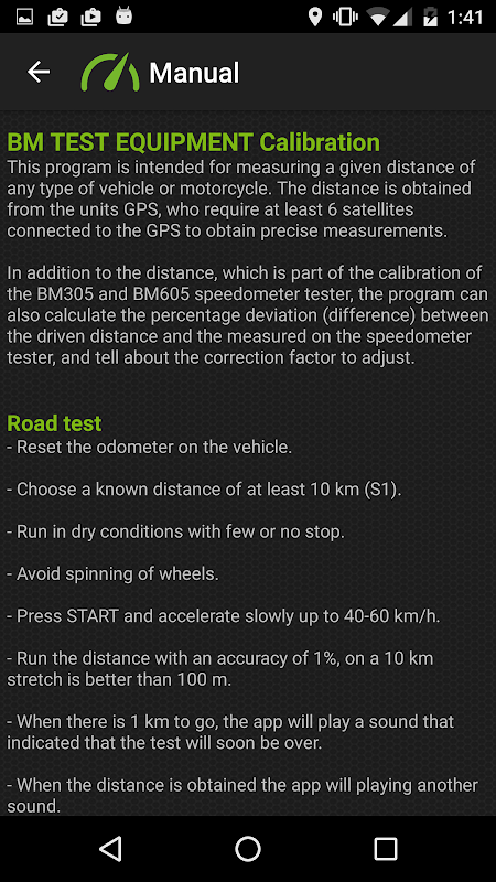 Dette program er beregnet til at måle en given distance i hvilket som helst køretøj eller motorcykel. Distancen er målt vha. enhedens GPS, som kræver mindst 6 satellitter låst fast for at opnå en tilfredsstillende nøjagtighed.