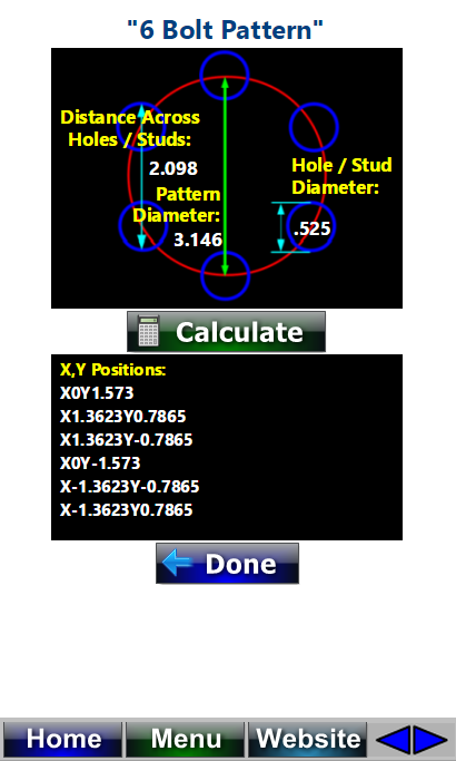 Web Machinistは、CNCの機械工、プログラマー、QC検査官のための多くの計算機を持っています。ボルトサークル計算機、ホイールボルトパターン計算機、角度用計算機を含む、CNCアプリケーション、G76ねじサイクル計算機を含むCNC旋盤Fanuc缶詰サイクル、簡易旋盤カムCNC旋盤工具補正Gコード計算機、面取りGコード計算機、メートル法、皿穴の深さ計算機、センタードリルの深さ計算機、一般的な変換、CNCの穴あけ加工、CNCミル&旋盤深穴加工の計算機、ダブテール測定計算機、青写真のシンボル、Gコード、Mコード、機械加工の数式と計算機、サークル解決式、ホールパターン、フルサークルパターンとパーシャルサークルパターンを含むホールアレイパターン、3本のねじ山ピッチ径の統一ねじ切り、メートルねじ、アクメねじおよびメートル台形ねじの計算機、CNC旋盤工具鼻半径補正計算機、QC検査、手動加工、金属除去率、CNCフライス加工、リファレンス、回転軸、スピード&F eeds、インペリアルとモジュールの平歯車寸法計算機、CNCタッピング、CNCのねじ切り、手動旋盤計算機、ユニファイねじ、メートルねじ、アクメねじ、メトリック台形ねじ、平歯車、モジュール平歯車、インペリアル平歯車、面積計算、三角形、円計算機、ミルマシンツーリング、コレット寸法、キーシートカッター計算機、三角法計算機、穴パターン計算機、ホイールミルパターン計算機、手動ミル計算機、ツーリング&ハードウェア、サインバーおよび複合サインプレート計算機、三角法および幾何学、Shop Math電卓スピンドル速度計算機、CNCタッピング速度計算機、表面粗さ計算機、掘削速度計算機、タッピング速度計算機、CNC旋盤およびその他の計算機。これは、機械工、CNC機械工、機械工房、QC検査官、CNCセットアップオペレータ、CNCプログラマーのためのプログラムが必要です。