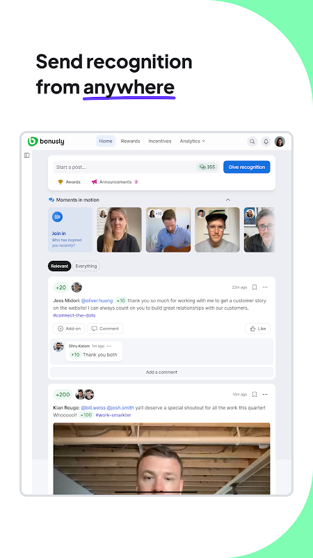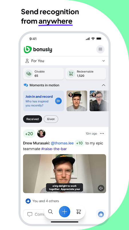Bonusly を使えば、成功を祝い、パフォーマンスを導くことがリアルタイムで行えます。外出先で評価を伝えたり、短いビデオを録画してパーソナルな印象を与えたり、会議の合間にチェックインしたりすることも可能です。同僚同士の感謝の気持ちを伝えたり、パフォーマンスの振り返りをしたりと、Bonusly はモバイルデバイスから、従業員のエンゲージメントと連携を維持し、最高のパフォーマンスを発揮できるようサポートします。