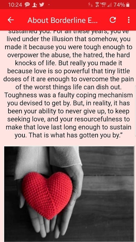 このアプリは、障害の原因、症状、関連する行動、BPDに関連する統計、現在の治療法など、境界性パーソナリティ障害を調査します。かつてBPDは治療不可能であると信じられていたにもかかわらず、適切な心理療法を行うことで、BPDを持つ多くの人々が良くなり、完全に回復することさえあることがわかりました。