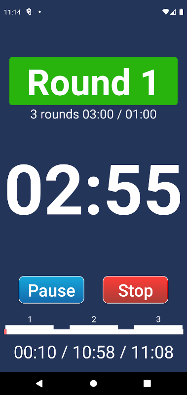 - 休憩のための赤の色、ラウンドのための緑の色、最後の15秒間のラウンドのためのオレンジ色