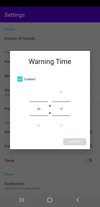 ラウンド、休憩、音、アラームの量と期間の両方を設定できます。