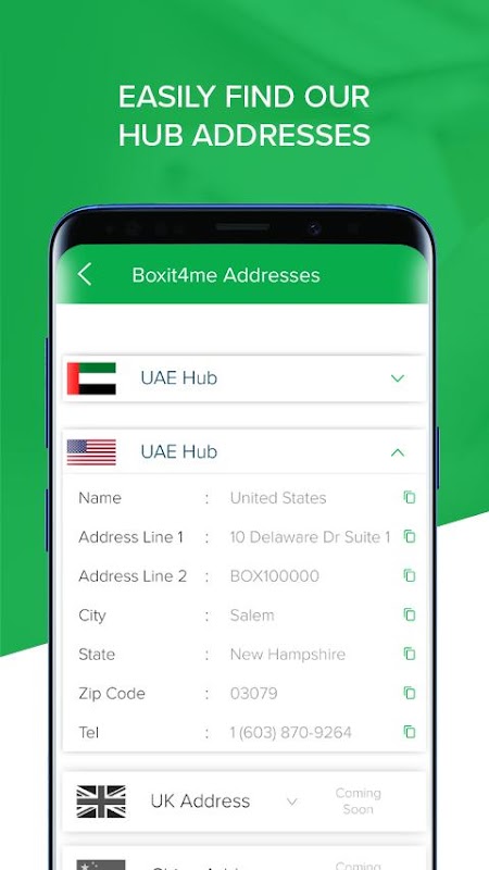 Boxit4me は、世界中 (米国 | 英国 | アラブ首長国連邦 | ドイツ | 中国 | 香港 | ルクセンブルグ | オランダ | ベルギー | フランス | KSA) に商品を送ることができるローカルアドレスを提供することにより、ユニークな ShopAndShip 体験を提供します。ユーザーは、個人用 (無料) とプレミアム アカウントのいずれかを選択し、次のような簡単で高度なオプションから好みを設定できます。