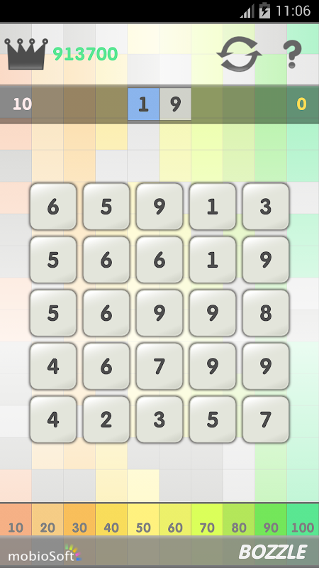 To get the number 100 you have perform the summing of random numbers appearing at the top panel. You must first get the number 10, then 20, 30 and so on. If in a block (button) you successively got the multiple of 10 number the color of the block (button) is changed, thus increasing the amount of points and the number of remaining moves.