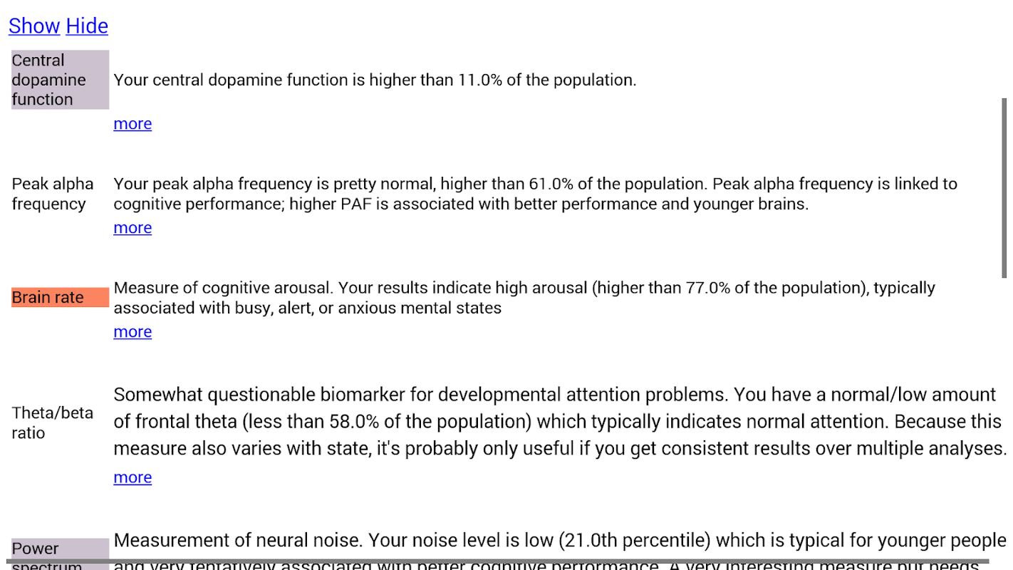 あなたの脳は他の人に比較して、どのようにそれが時間とともにどのように変化するかを参照してください。 BrainPrintはピークアルファ周波数と中央のドーパミン機能のような認知能力に関連する脳の指標を追跡するために、定量的EEG技術を使用しています。