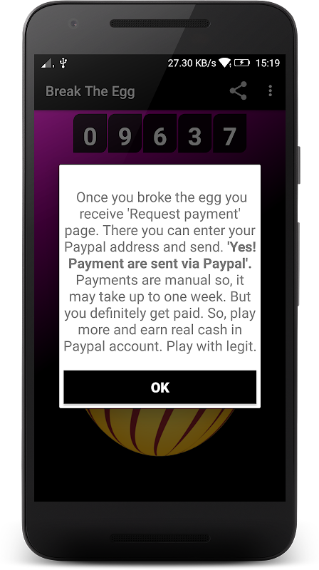 Break The Egg is real cash app. Just tap on egg for 100000 times and receive 5$ real money.