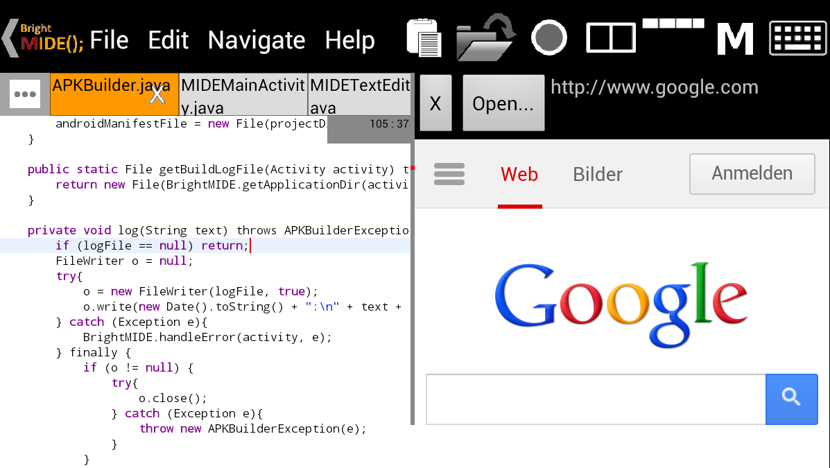 Bright M IDE is a full mobile integrated development environment (IDE) for Android devices. With this app you can create, modify and build Android apps on your Android tablet or phone.