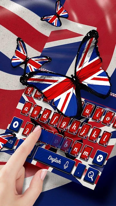 Notice: The British Flag theme is a plugin app, please download the Main Keyboard app first for blue red stripes butterfly theme to run. Tap the INSTALL button and download it for FREE! If you already have the Main Keyboard installed, please tap on the APPLY button and the British Flag Keyboard theme will be installed on your phone automatically.