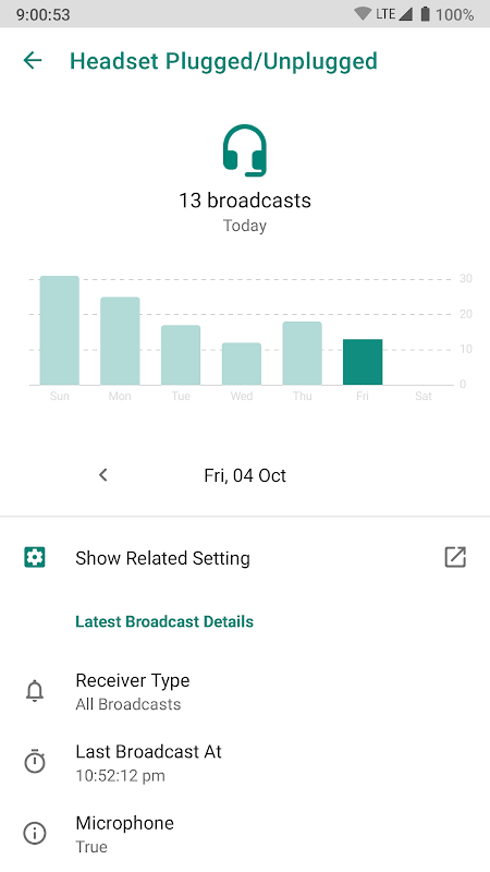 アプリは、チャートおよびリスト形式で、毎日(過去4週間)の放送の日ごとのリストを表示します。このリストはさまざまな形式で並べ替えることができます。