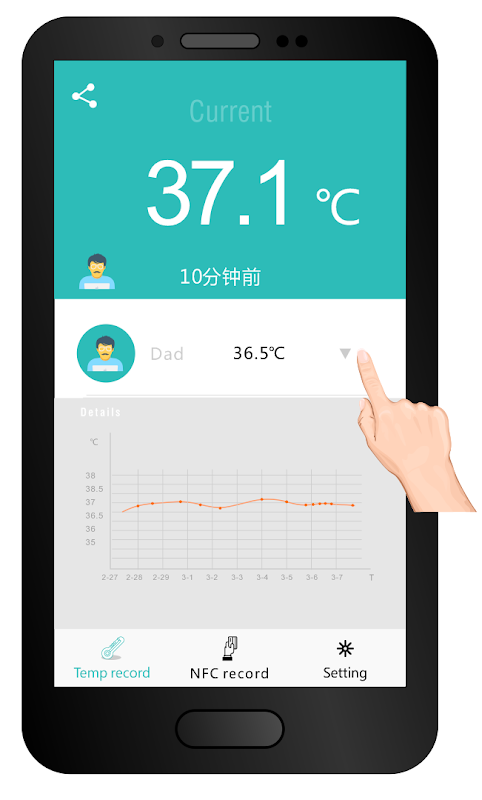 It work with a physical thermometer, which is Bluetooth enabled hardware, Users can easily connect through TempCapture app, to view the history data it collected. It provides more efficient way for people to collect, review, trace temperature change of specific person.