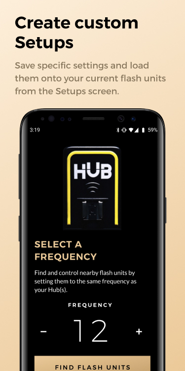 HUBリモートを使って、セットアップ内のPaul C. Buff, Inc.製フラッシュユニットを見つけられます。セットアップに追加すると、フラッシュとモデリングランプの両方の出力を制御し、スマートフォンから直接オン/オフを切り替え、セットアップを保存して後で使用できるようになります。