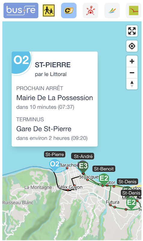 レユニオン行きのバスで安心してご旅行ください。 Car Jaune、Kar'Ouest、CarSud、Alternéo ネットワーク上の次のバスの位置を一目で視覚化します。