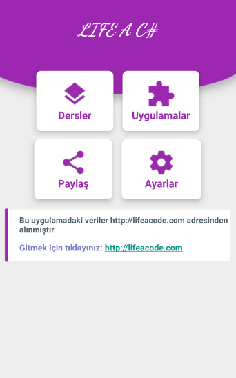 Uygulama da C# programlama dilinin konu anlatımları ve uygulamaları bulunmaktadır. Bu uygulamada konu anlatımları tamamen Türkçe olarak ve tamamen özgün bir şekilde hazırlanmıştır. C# Programlama Türkçe olarak anlatılmış ve içerik olarak zenginleştirilmiştir. Uygulamadaki içerikler http://lifeacode.com web sitesinde alınarak oluşturulmuştur.