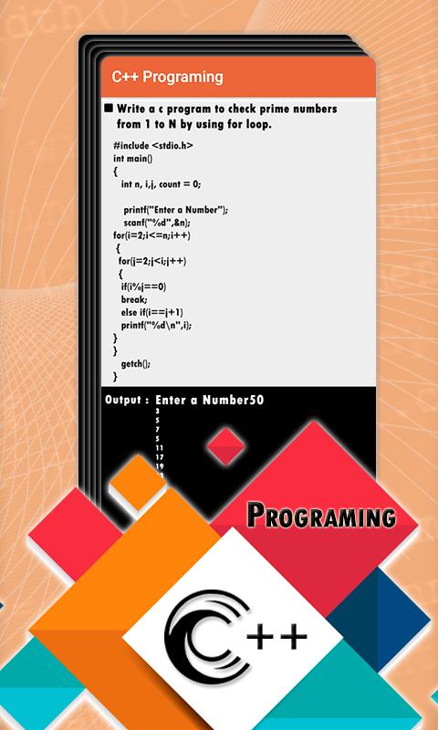 C++ is a general-purpose programming language. It has imperative, object-oriented and generic programming features, while also providing facilities for low-level memory manipulation. In this app you will get the more than 100 C++ Programs and output as well.