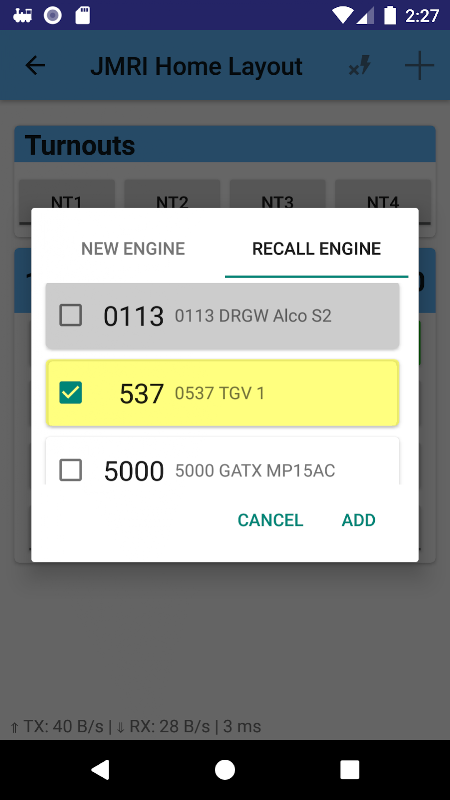Cab Engineerアプリケーションは、現在のJMRIサーバーとインターフェースし、スマートフォンまたはタブレットを介してレイアウトを制御する簡単な方法を提供します。アプリケーションは、(列車を運転するための)スロットルと分岐制御をサポートします。列車は、DCCアドレスまたはJMRIエンジン名簿から選択できます。