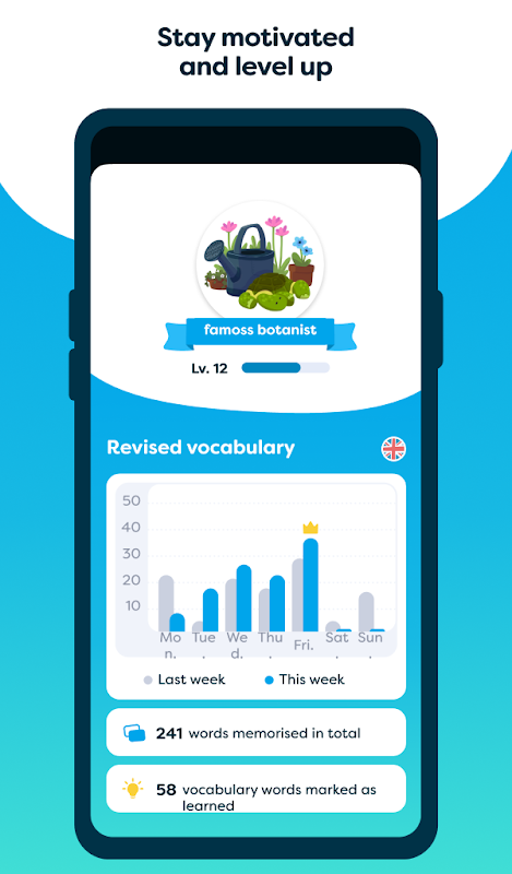 さまざまな演習で語彙を学び、課題を克服してレベルアップしてください。この語彙トレーナーを使用すると、学習が退屈ではなくなり、簡単になり、モチベーションが高まります。