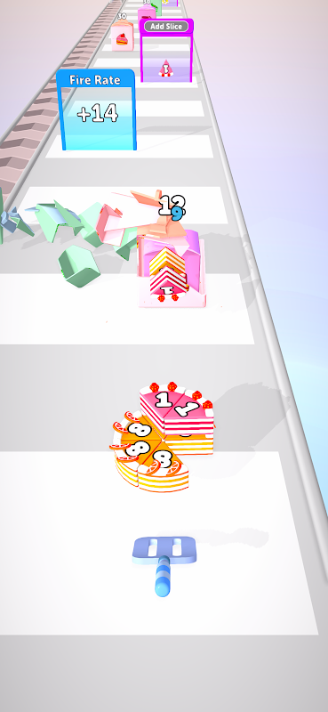 さあ、ゲーム開始!おいしそうなケーキが6つのスライスに分かれていて、それぞれに価値が与えられています。ヘラを軽く振って、スライスを次々と投げて、料理リレーを繰り広げましょう。ケーキの土台に積み重なるスライスゲートをくぐり抜けながら、コースを駆け抜けましょう。同じスライスが積み重なると魔法が起こります。より価値の高いスライスに!「1」のスライス2つが「2」に、「2」のスライス2つが「4」に。ケーキコンボのカスケードが生まれます。