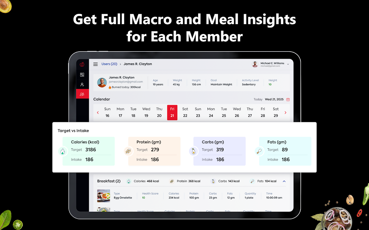 すべてのクライアントをシームレスに管理し、毎日の消費カロリーをモニタリング、栄養を追跡し、記録された食事を確認することができます。これらはすべて、使いやすい単一のインターフェースから行えます。