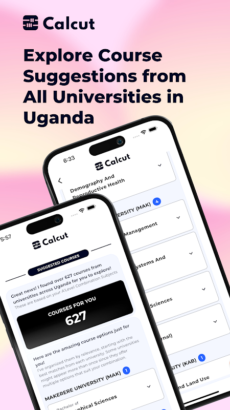 受賞歴のある直感的でシームレスかつ効率的なアプローチは、何千人もの学生がカットオフ点を計算するために信頼しています。 Calcut アプリを使用すると、大学 (キャンパス) への入学を計画しているウガンダの学生は、[大学在学中に受講したいコースの] カットオフ ポイント (アカデミック ウェイト) を数秒で簡単に計算できます。