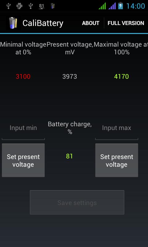 NOTE: only Max and Min levels are correct, the linear calculated % values may differ from system's or other app's battery info, it's not a bug.