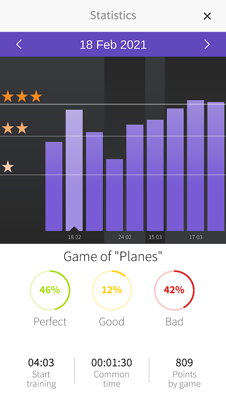 各トレーニング セッションの後に、演習がどの程度成功し、正確に実行されたかを示す統計が表示されます。