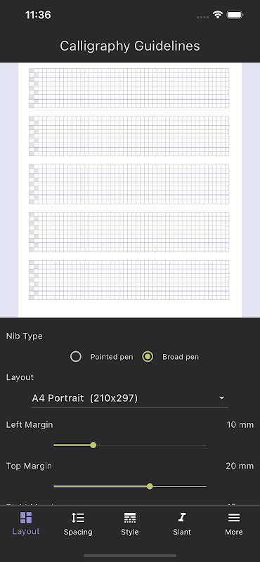 サブスクリプションなしの無料版では、尖ったペン先と幅広のペン先の両方のすべての設定をカスタマイズし、結果として得られるガイドシートを画面上でプレビューすることができます。