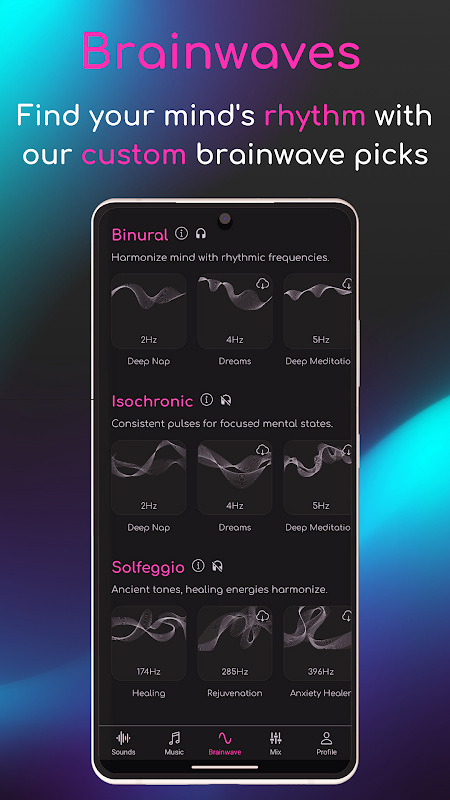 Calmspace は、バイノーラル ビート睡眠療法、等時性脳波、ソルフェジオ周波数の治療の可能性を活用し、リラクゼーション、ストレス軽減、精神的健康に対する科学的に裏付けられたアプローチを提供します。