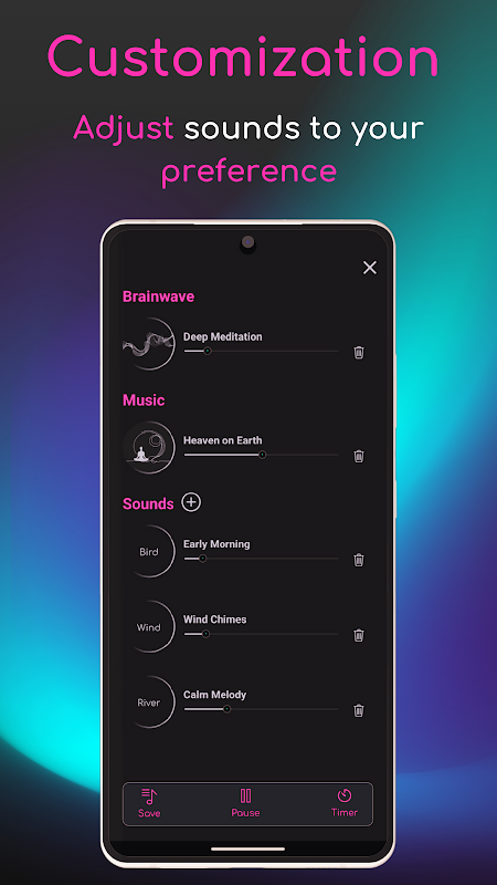 - 個別の音量コントロールで完璧な聴覚背景を作り、ストレス解消とリラクゼーションの旅を強化します。