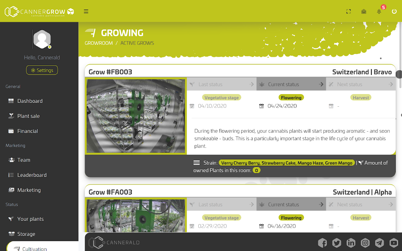 CannergrowはCanneraldによって設立されたプロジェクトであり、専門的な育成と使いやすいCustomer-End-Webインターフェースを組み合わせています。私たちが提供するのは、これまでのところ、大麻業界全体で最初の植物成長サービスだけです。世界中の誰もが私たちと一緒に大麻産業を始めることができ、仮想栽培者となり、この巨大な10億ドル規模の市場の一部を手に入れることができます。お客様を満足させるために最高品質を第一に考えています。このレベルの満足度を確保できるように、私たちは大麻業界に新しい基準を設定する一方で、スイスの品質基準を厳守しています。