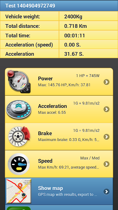 力、速度、ブレーキ力を測る。スピードメーター。マップ内の結果と経路を追跡