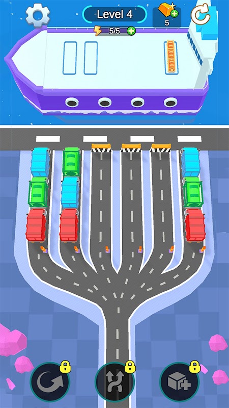 ゲーム内の各ステージはユニークな物流パズルです。初期レベルでは、ゲームの基本的な操作やルールに慣れてきます。画面では、色鮮やかな輸送車両が入り組んだ港の道路に並んでいますが、あなたの目標は画面をスライドさせることで、車両の走行方向を調整し、車体の色に合った荷下ろし通路に入ることです。色を正確にマッチングしてこそ、貨物はスムーズにアンインストールでき、後続の輸送任務のために空間を空けることができる。