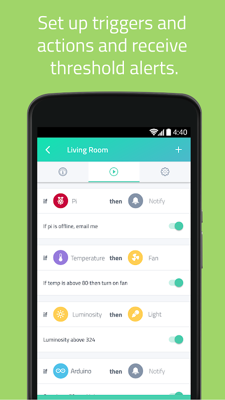 You can add, manage and control sensors and actuators from your phone’s dashboard from a library of drag and drop widgets.