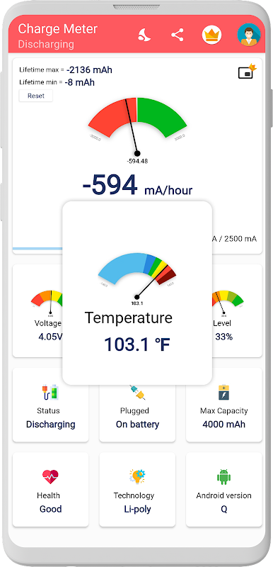私たちは、バッテリー統計の品質と情熱に焦点を当てたチームです。 Charge Meterは、プライバシーを保護する情報へのアクセスを必要とせず、虚偽の主張をしません。あなたが私たちのアプリが好きなら、プレミアムバージョンにアップグレードすることによって私たちをサポートしてください。
