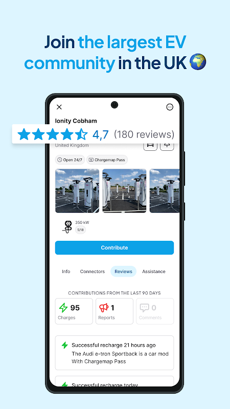 毎日、新しい充電ステーションにログインしたり、情報や写真を追加したり、各充電ステーションにコメントを投稿したりして、互いに助け合うEVドライバー最大のコミュニティに参加しましょう。