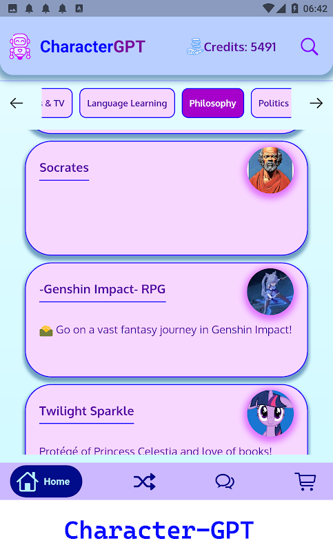 このアプリを使えば、誰とでも話すことができます!アニメ、政治家、芸能人など数えきれないほど!あなたがしなければならないのは、私たちの美しく便利なインターフェースで適切なキャラクターを見つけることだけです. GPT Character を使用すると、24 時間 365 日いつでも好きな人と会話して、絵を描くことができます。あなたがしなければならないのは、投稿を書いて魔法を見るだけです! CodierSoft の努力の結果、キャラクター GPT が作成されました。このアプリを使えば、誰とでも通話できます!アプリケーションに問題がある場合は、お問い合わせください。
