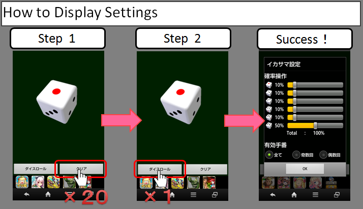 イカサマシリーズ第2弾!!各出目のでる確率を操作できるダイスアプリです。確率操作のほか、有効なターンの設定も可能です。