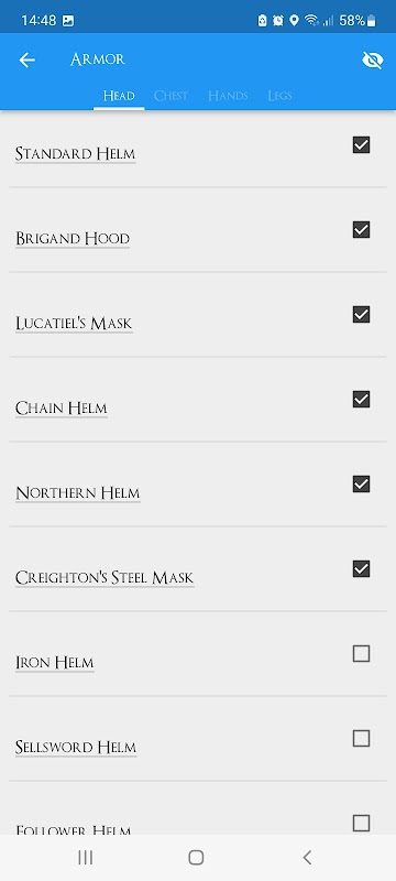 プレイスルー、実績、武器/盾、鎧、取引のチェックリスト。