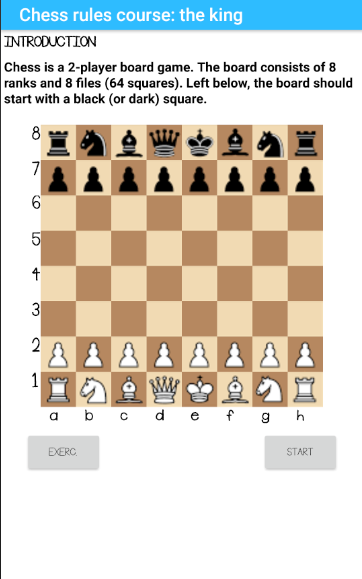 The course aims to be a user-friendly, safe, commercial-free and motivating way to learn chess, step by step. Every course part exists of an explanation, followed by exercises. There is no exam, or track of score; it's perfectly ok to make as many errors as needed. Because of random selection of exercises, repetition may occur. Please be patient. Repitition is the mother of skill.