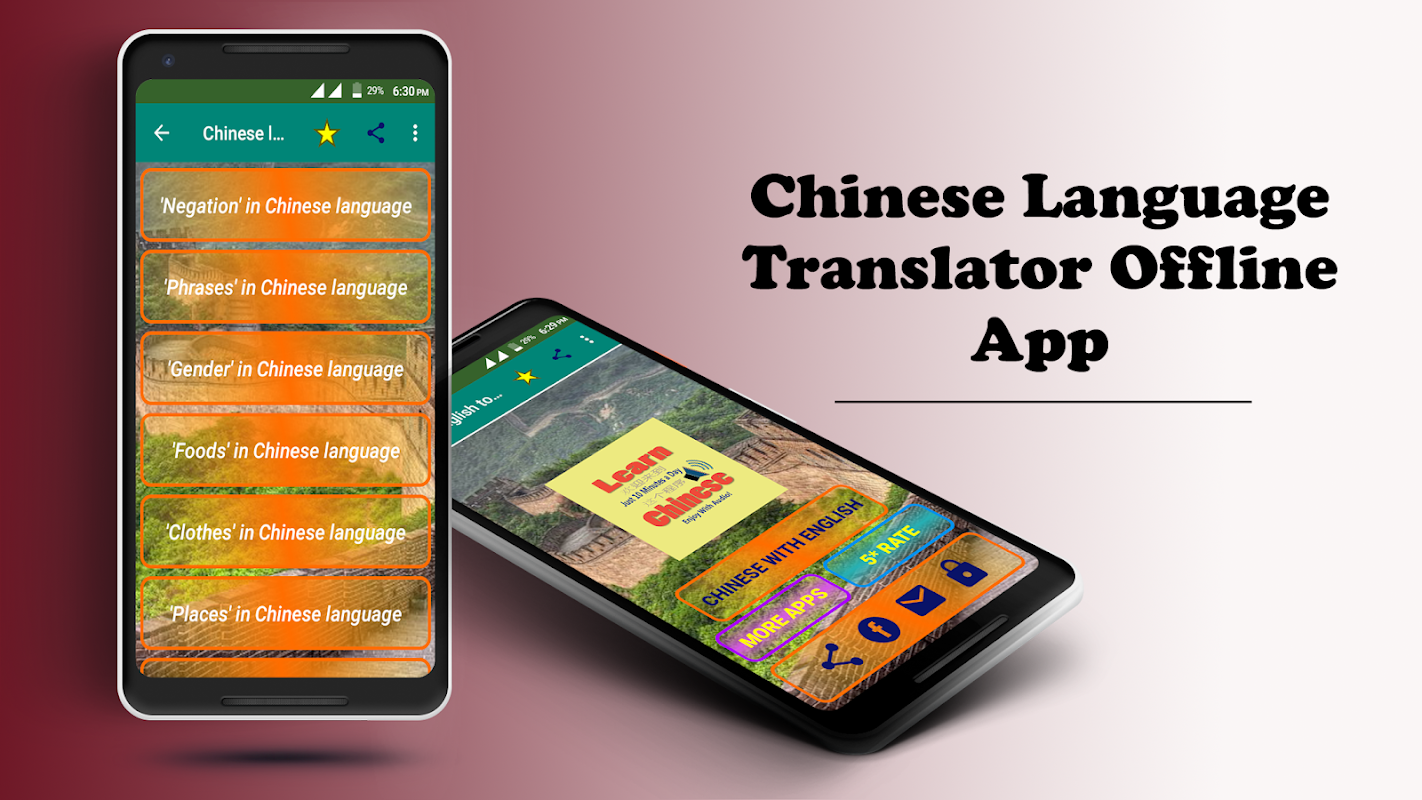 中国語学習アプリには、中国語の中国語で1367の一般的なフレーズ単語または小さな文があり、音声または音声が含まれています。インターネットに接続していなくても、それらすべてを使用できます。中国語に最適なアプリは、音声翻訳者の中国語から英語へのオフライン学習を促進し、非常に簡単に中国語の世界に旅行するのに非常に便利です。中国語を使って中国語のアプリケーションを学ぶのはとても簡単です。