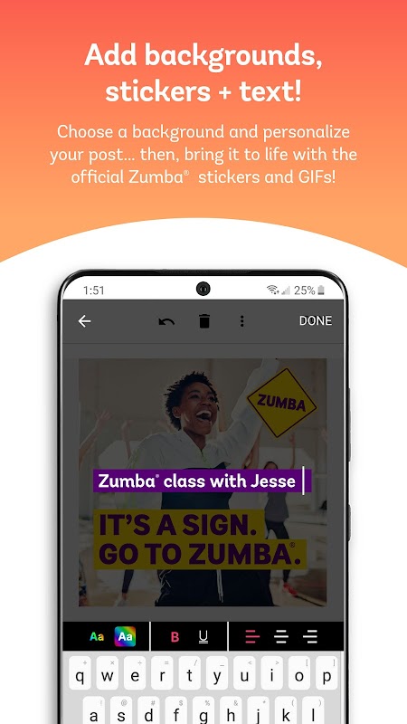 背景を選択し、テキストであなたの投稿をパーソナライズしてください…それから、公式のZumba®ステッカーとGIFでそれを活気づけてください!