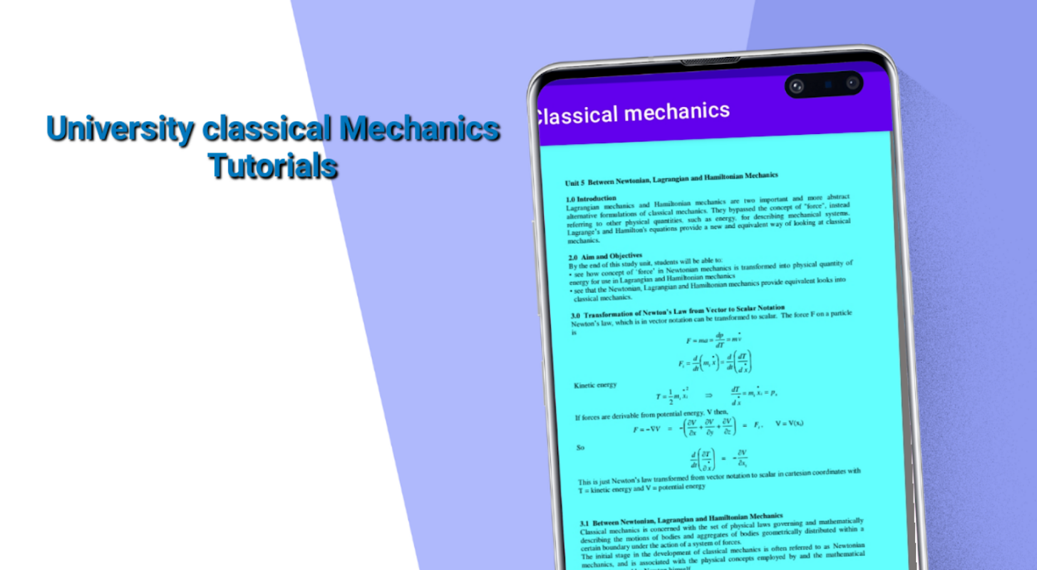The application features classical mechanics notes plus self assessment exercises from the following topics